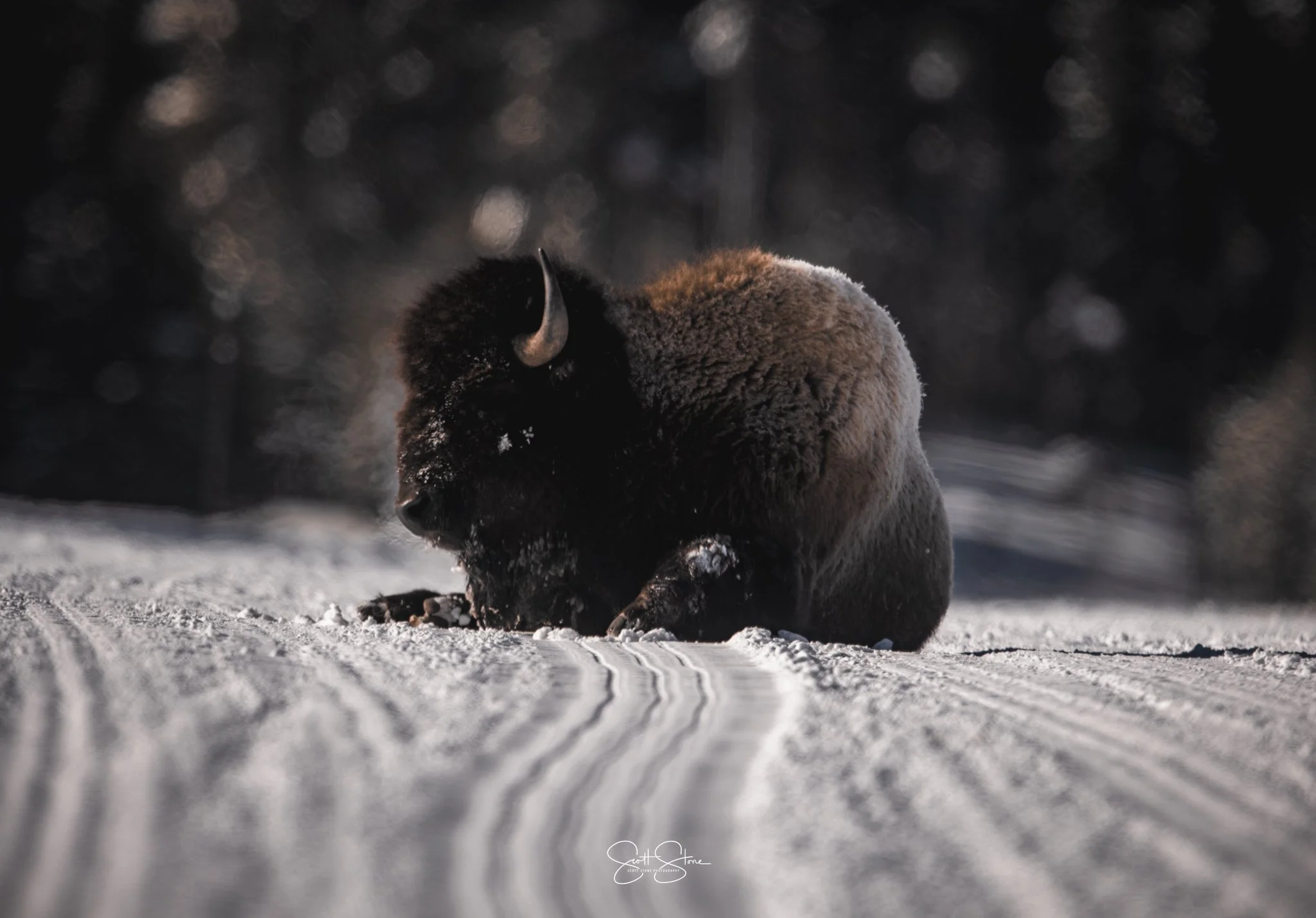 A bison resting on snow-covered ground with a snowy forest in the background.